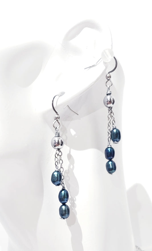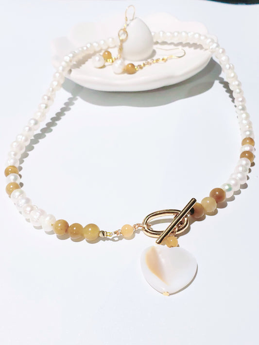 Delicado y Moderno Collar de Perlas de Agua Dulce Con un Toque de Cuarzo en combinación con unos Aretes Largos