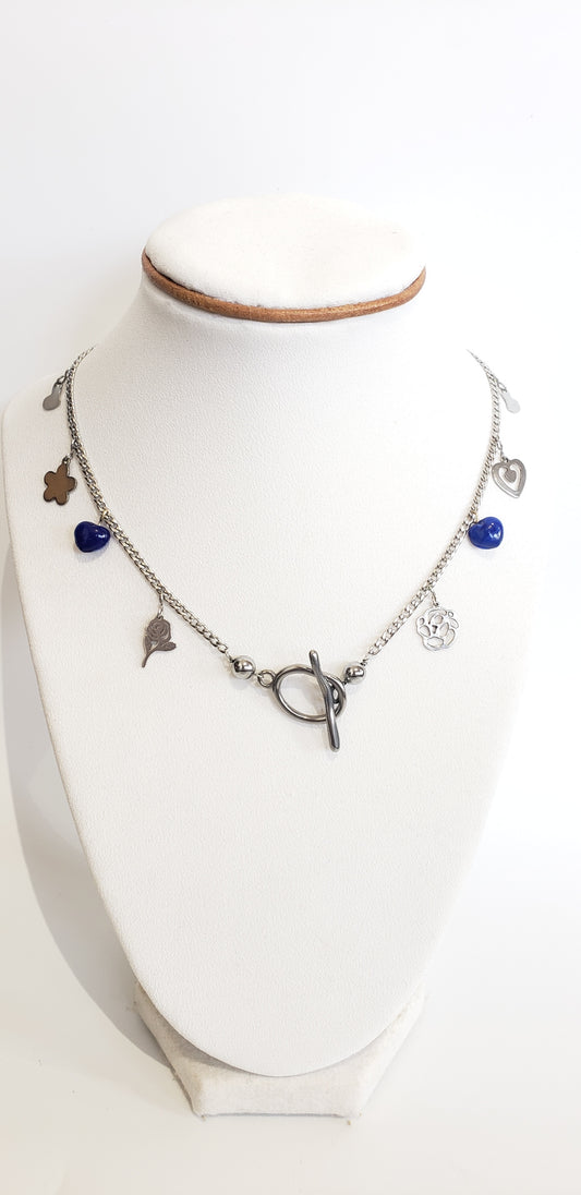 Collar en Acero Inoxidable con Encantadores Dijes de Flores y Corazones.