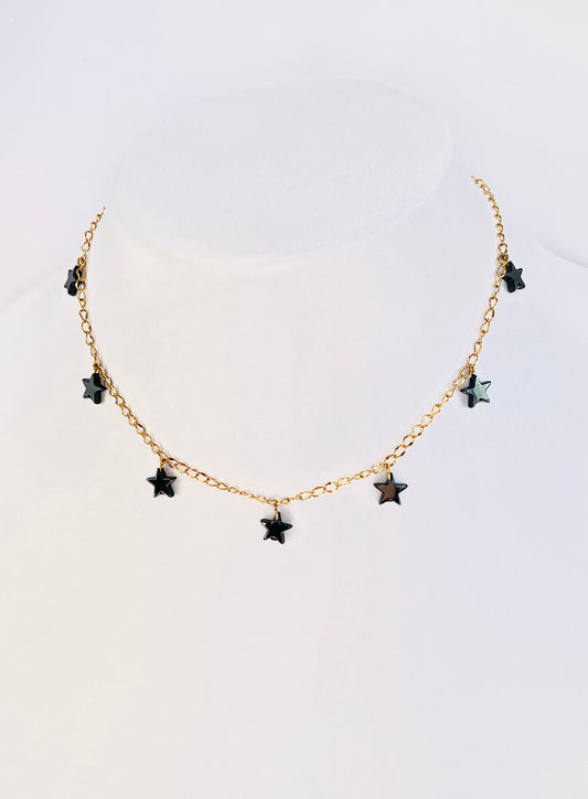 Este collar en acero inoxidable dorado con colgantes de estrellas en hematite es el complemento perfecto