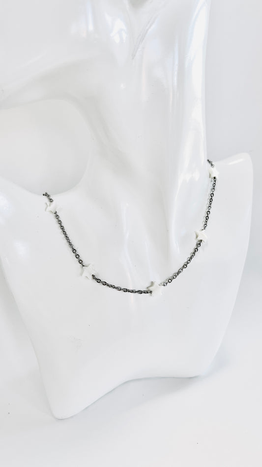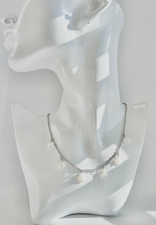 Este delicado collar en Acero Inoxidable con Estrellas de Concha Blancas , aporta un toque chic y modern