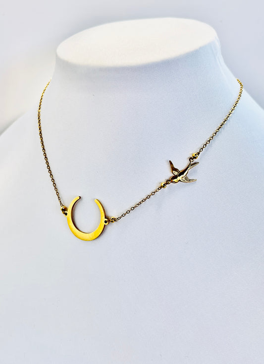 "Danza Nocturna" Collar de Media Luna y Colibrí en Acero Inoxidable"