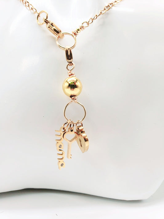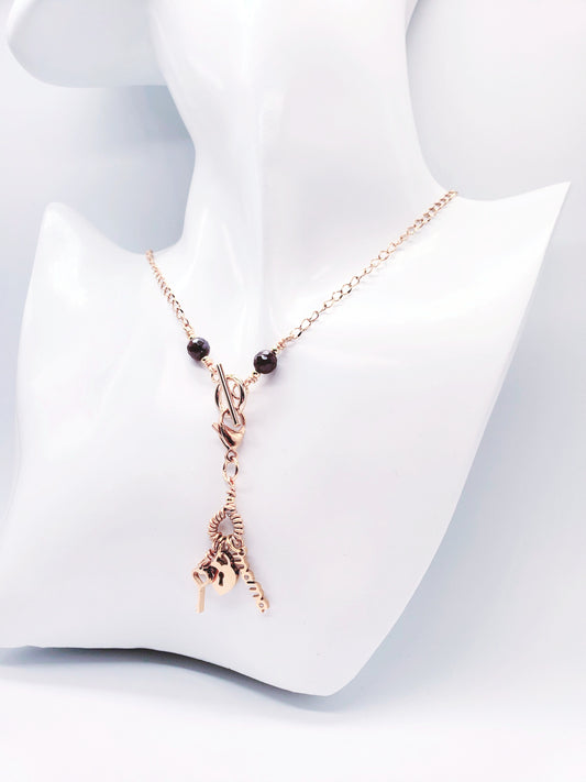 Déjate seducir por la belleza clásica y la elegancia eterna de nuestro Delicado Conjunto de Collar y Aretes, con Un Colgante Desmontable en Piedra de Cuarzo Rosado que irradia un brillo natural que captura la luz a cada paso