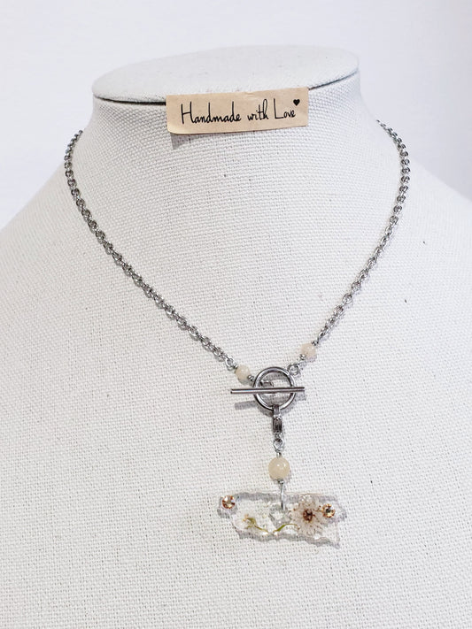 Dos estilo en Un mismo Collar, Collar en Acero Inoxidable con Dije del Mapa De P.R. en Resina Trasparente con Flores secas y otro dije en Resina con Flor de Diente de león real