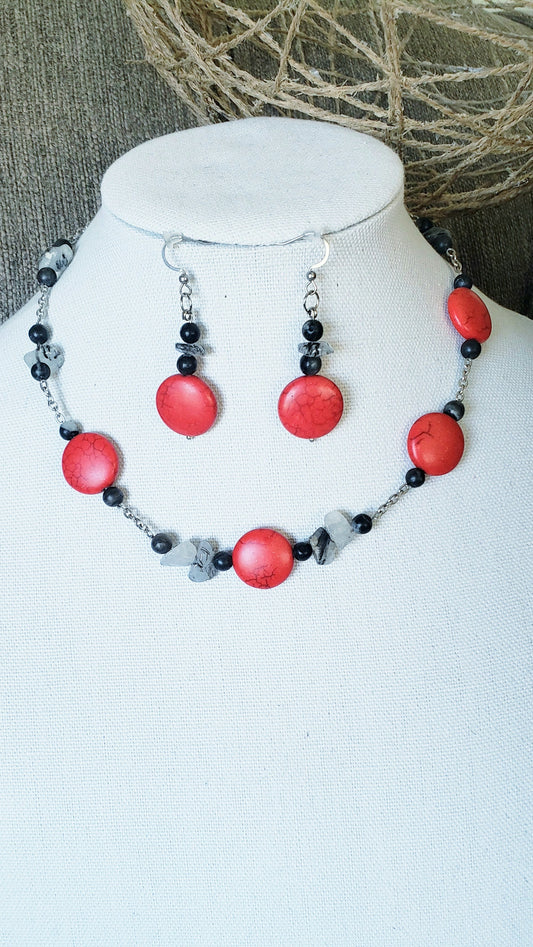 Precioso conjunto incluye collar y pendientes con impresionantes piedras de Howlita roja.