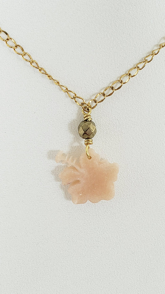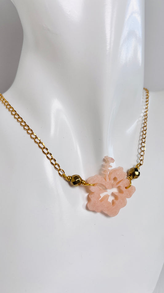 Collar en Acero Inoxidable Flor Maga en Resina color Durazno Pastel Piedra Hematite Dorado
