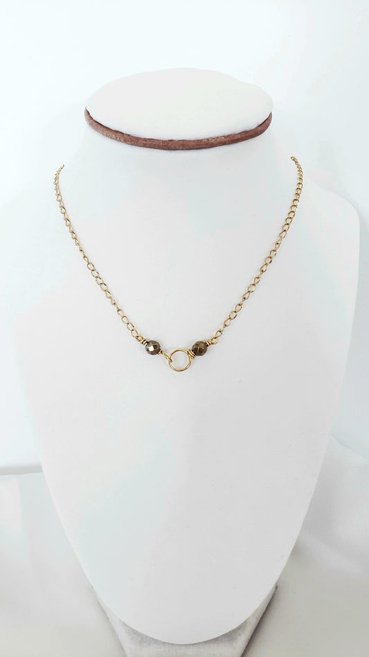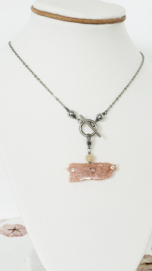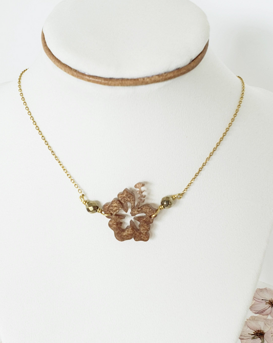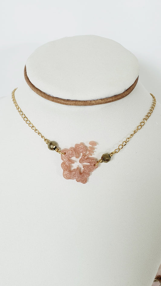 Collar en Acero Inoxidable conla Flor Maga en Resina color Pastel durazno con Piedra Hematite dorado