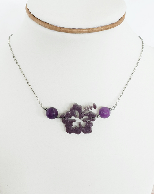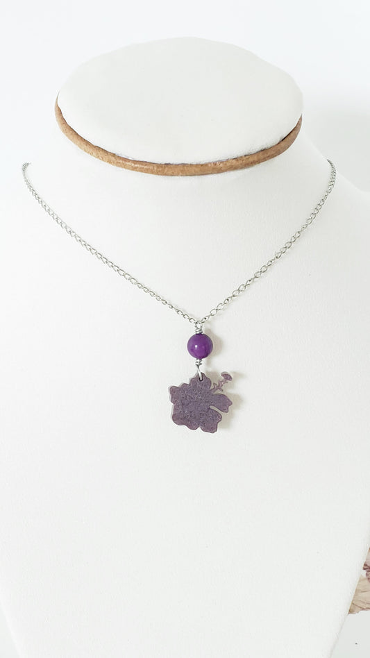 Collar en Acero Inoxidable Flor Maga en Resina Violeta y Cuarzo Violeta