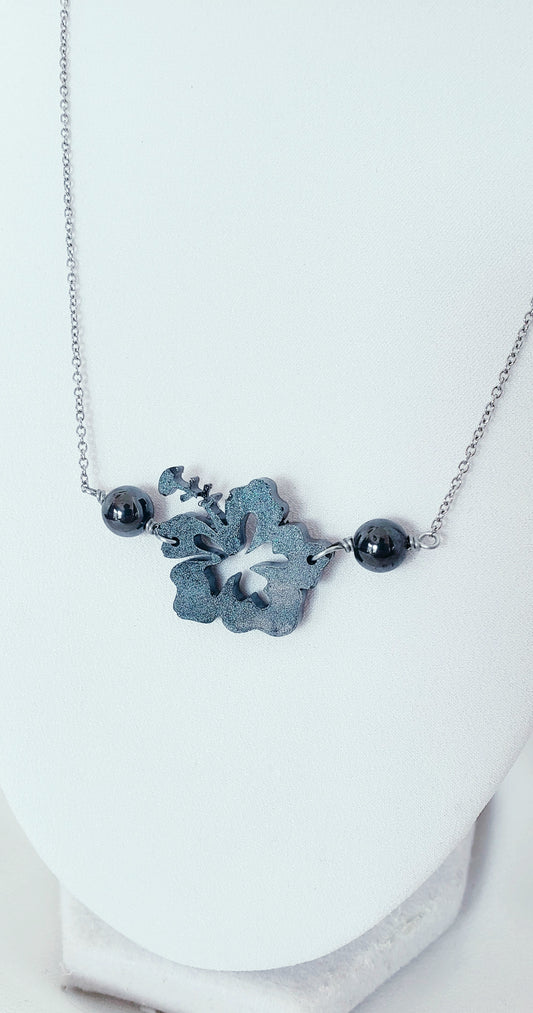 Collar , en Acero Inoxidable con Flor Grande Maga en Resina Negro con Piedra Hematite Negro Plomo