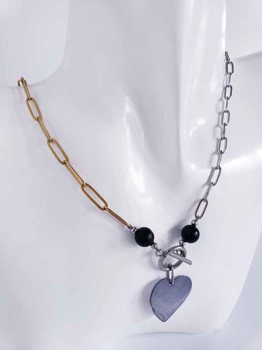 Moderno Collar combina el Color Dorado y el Plata, junto con llamativa piedra preciosa de ónix negro y Un Colgante Capiz en Forma de Corazon…