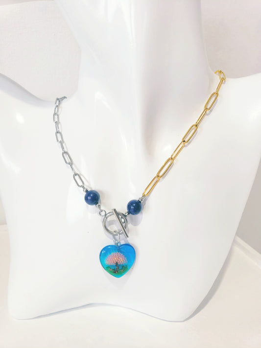 Moderno Collar combina el Color Dorado y el Plata, junto con llamativa piedra preciosa de Lapis Azul y Un Colgante en Forma de Corazon en Millefiori Glass …