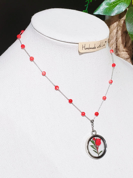 Collar de Plata 925. Con hermosa cuentas de concha de nácar con un medallón de cristal de flores rojas secas reales, es la manera perfecta de agregar un toque llamativo a su estilo.