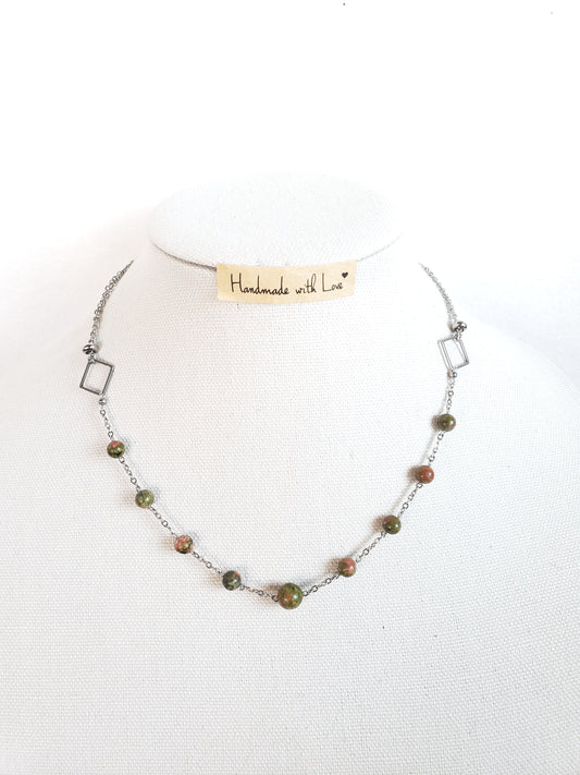 ¡Este precioso collar combina piedras de Unakita color Verde y Coral, para crear un look realmente único y llamativo.