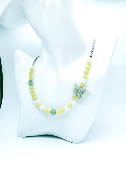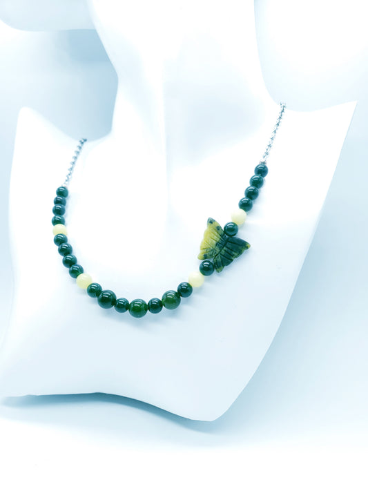 Collar de Jade verde oliva y Cuarzo Verde Oscuro con una Mariposa en Piedra
