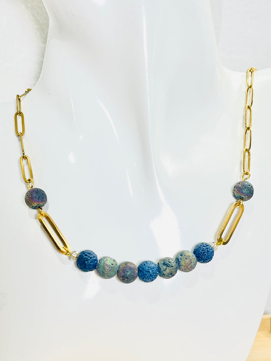 Collar de eslabón en Acero Inoxidable con Piedra de Lava Rock Azul y Tornasol